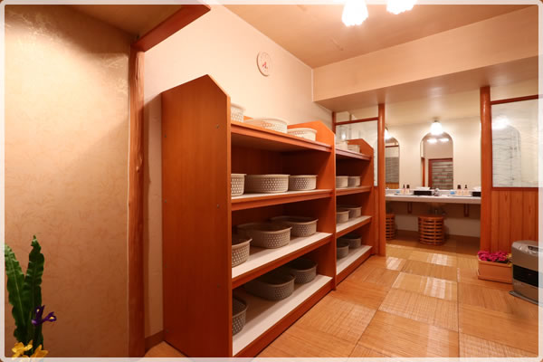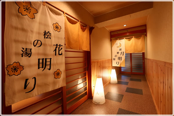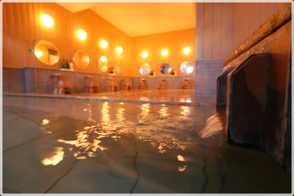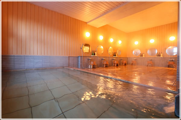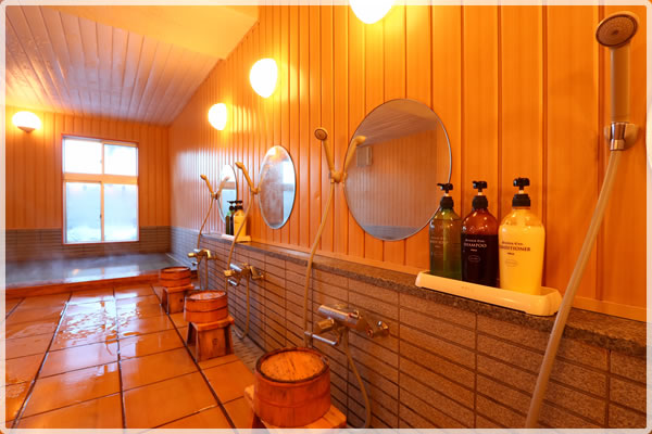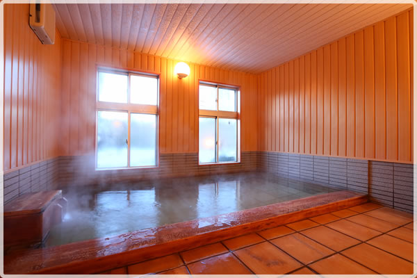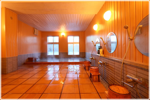 大浴場[桧の湯花明かり]は木のぬくもりに包み込まれるような優しい空間…桧の香りを感じられる浴場です