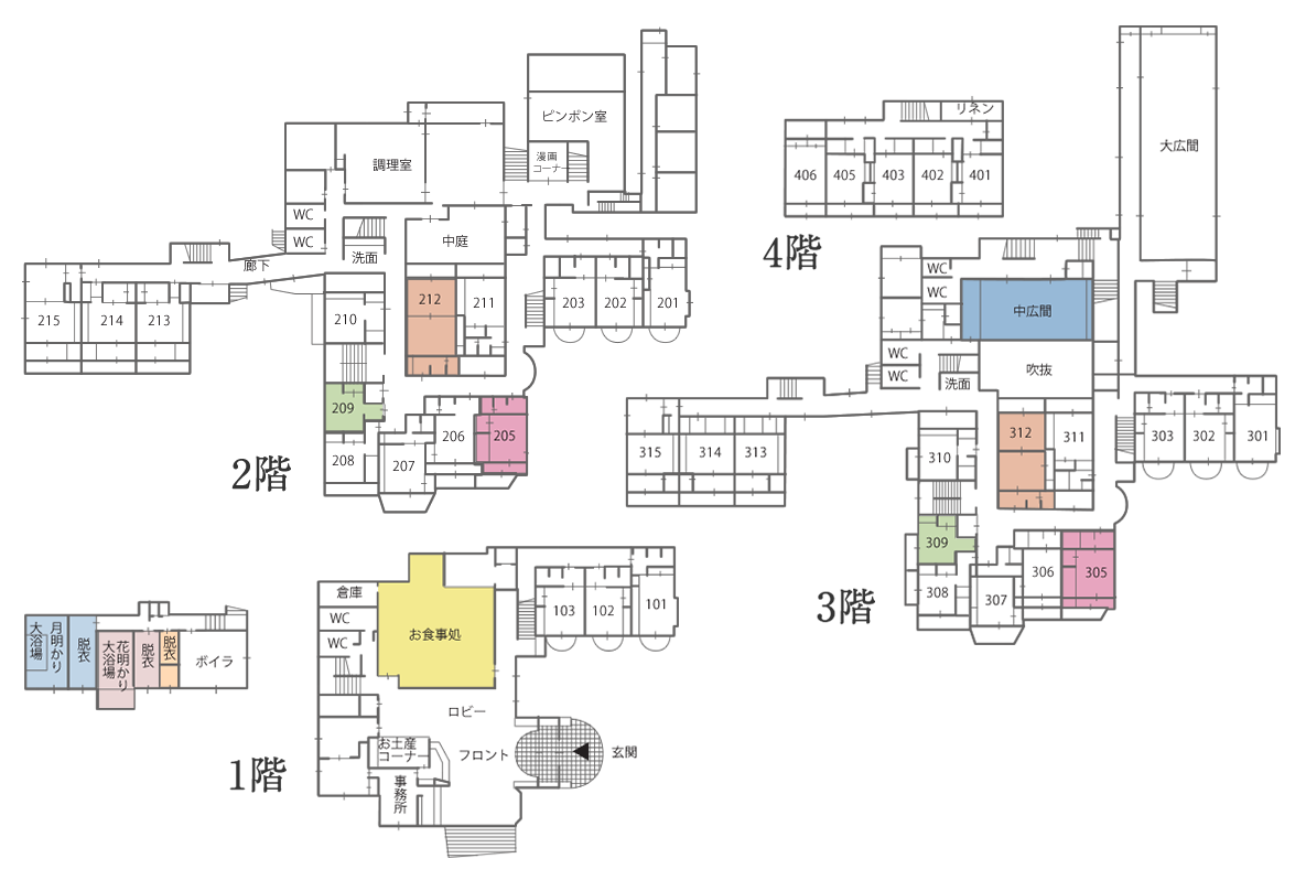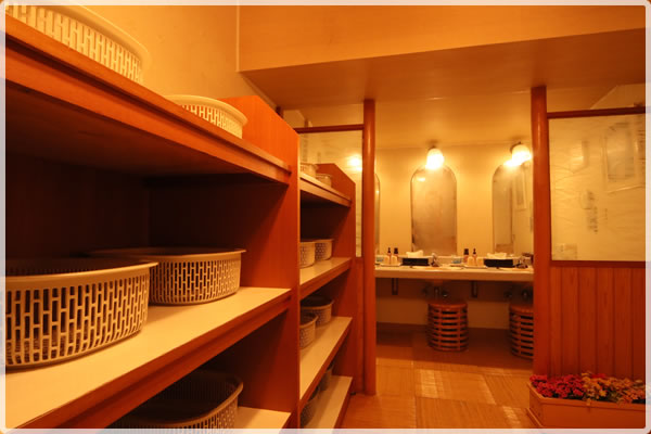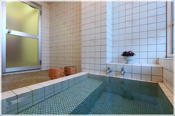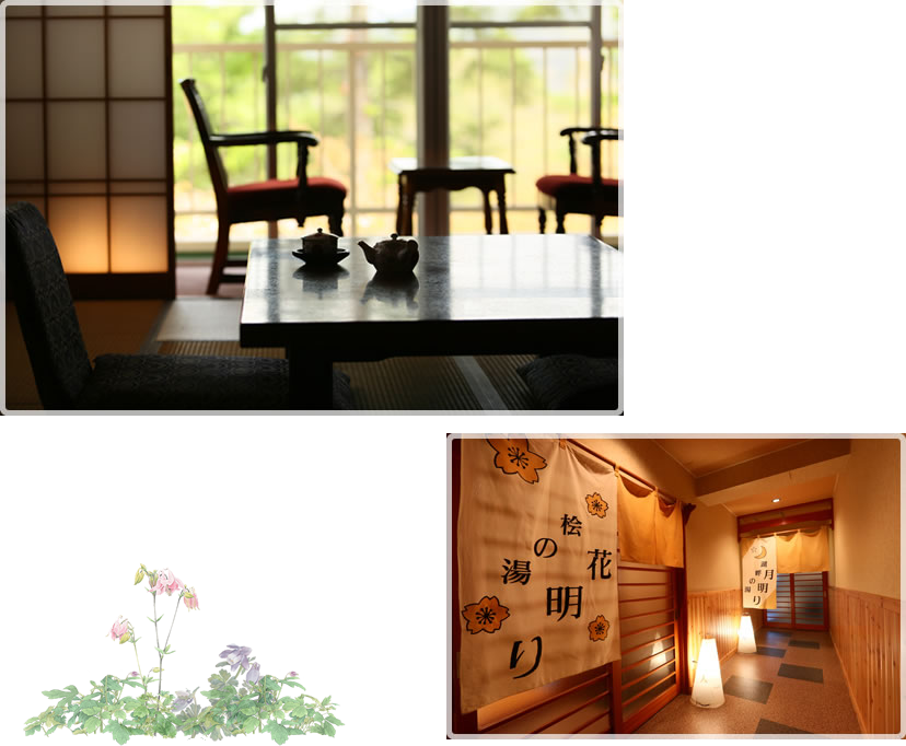 ホテル山水荘の大浴場は石造りの月明かり、檜造りの花明かりと貸切風呂の3つがございます。